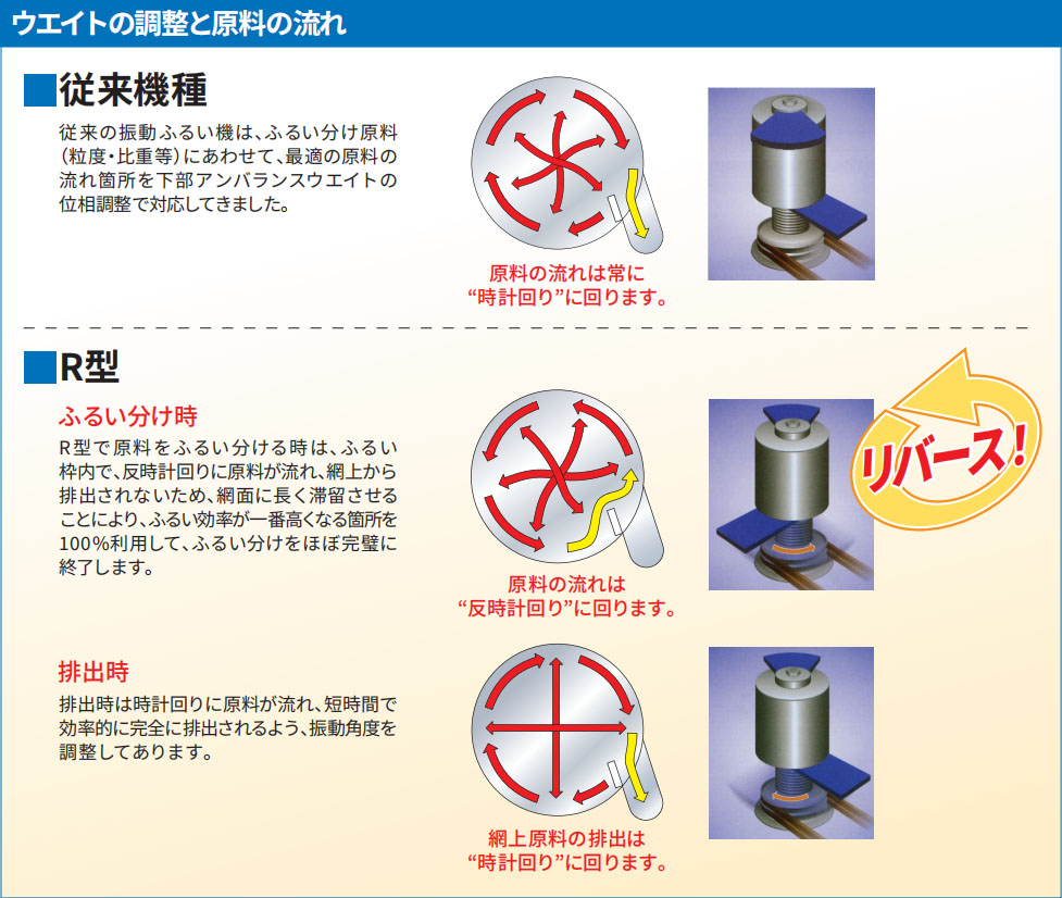 振動體の下部アンバランスウエイトの位相調(diào)整によって、原料の流れ箇所をコントロールするのが従來の振動ふるい機。