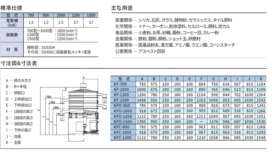 円型振動ふるい機が開発されて以來、現(xiàn)在も一般的に使用されているスタンダードな機種です。あらゆる業(yè)種においてふるい選別に責(zé)獻、とくに濕式用途で多く利用されています。KFシリーズは乾式·濕式いずれでも簡単に使用でき、振動ふるい機各シリーズの中でも最もリーズナブルなタイプです。