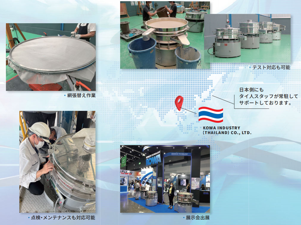 タイ王國(guó)バンコク郊外に位置し、タイ國(guó)內(nèi)でのメンテナンス業(yè)務(wù)を始め、アジア圈での販売拠點(diǎn)として2016年3月に設(shè)立致しました。2020年からはタイでのふるい機(jī)組立を開(kāi)始し、海外でも安心してご使用いただける環(huán)境作りをしています。これからも海外で“日本と変わらぬサービス”を目指して參ります。
