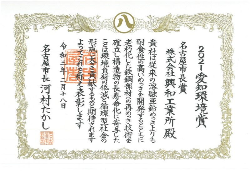 興和(山東)機械有限公司的日本本社株式會社興和工業(yè)所于2021年2月18日榮獲2021年度愛知縣環(huán)境保護獎。茲用來表彰株式會社興和工業(yè)所不同于一般的鍍鋅工藝,在研發(fā)使用高耐腐蝕性電鍍技術(shù)的同時,通過對老化鋼材的再電鍍技術(shù),實現(xiàn)了構(gòu)造物壽命的延長,對環(huán)境保護及構(gòu)建循環(huán)型社會做出了重大貢獻。